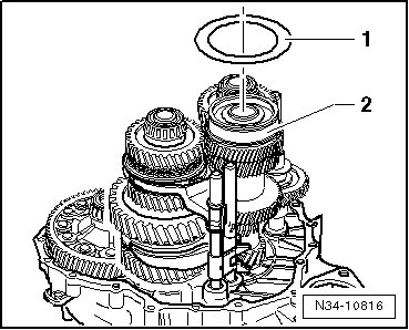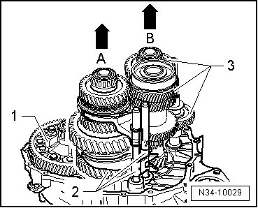 - Have the second technician lift the input shaft, the 5th and 6th gear output shaft and reverse gear - 2 - together with the reverse gear shaft slightly at the same time.