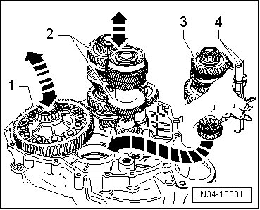 - Hold the output shaft for 1st through 4th gear - 3 - and the selector shafts - 4 - with the right hand.