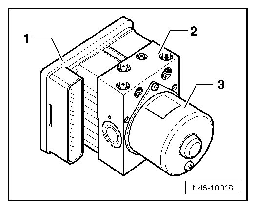 The control module - 1 - and hydraulic unit - 2 - comprise a single unit. Separation can only be performed when removed from vehicle. The hydraulic pump - 3 - must not be separated from the hydraulic unit.