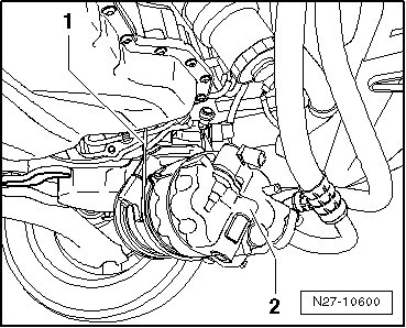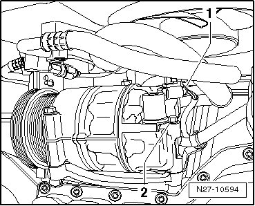 - Release and disconnect connector - 1 - and remove air conditioning compressor bolt - 2 -.