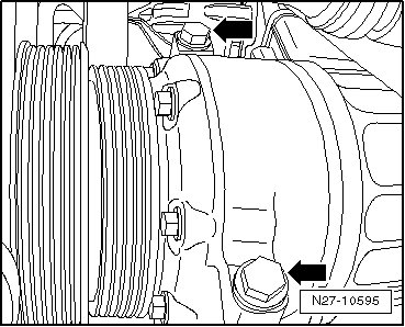 - Remove the both bolts - arrow - and remove the A/C compressor from the accessories bracket.