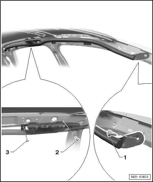 - Remove the bolt - 1 - (4.5 Nm). As am alternative, the side curtain airbag can be secured in this position with a metal eye and a locking pin.
