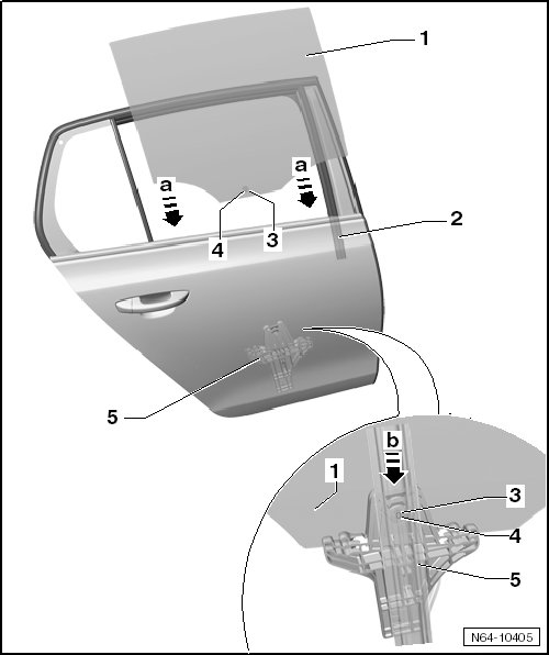 - Install the door window - 1 - into the door - 2 - and insert the door window into the slot in the window regulator guide - 5 -.