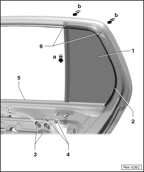 - Remove the door window - 1 - and the bar - 6 - - arrow b - from the door - 3 -.