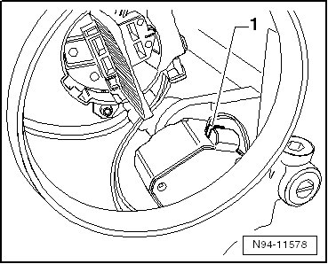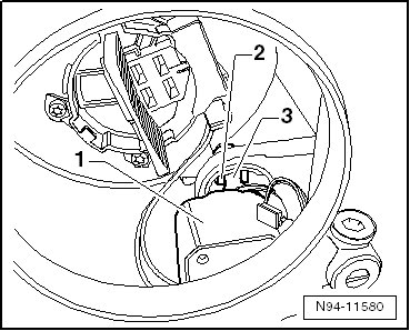- Turn the headlamp range control positioning motor - 1 - in - direction of arrow - all the way until it stops and then pull it out of the mount - 2 -.