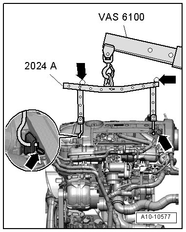 - Install the engine sling (2024 A) as illustrated and lift the engine using the shop crane - load cap = 700-1200 KG (VAS 6100) from the engine-/gearbox jack (V.A.G 1383 A).