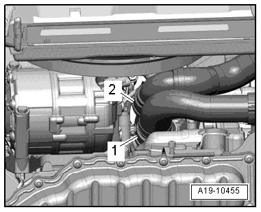 - Remove the lower coolant hose - 1 - from the radiator and allow the coolant to drain.