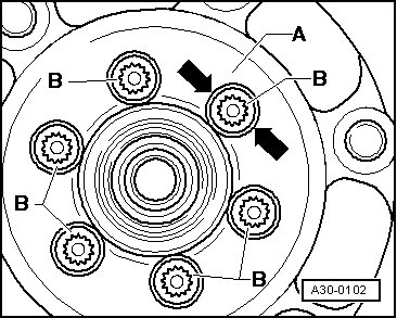 - Rotate the dual mass flywheel - A - so that the bolts - B - are centered in the holes - arrows -.