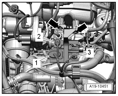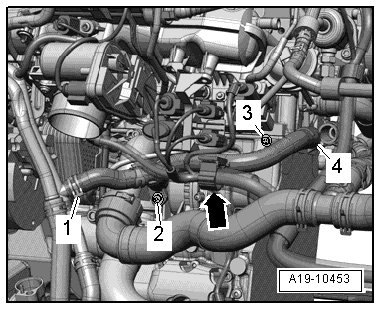- Remove the bolt - 1 - and remove the charge air pipe downward.