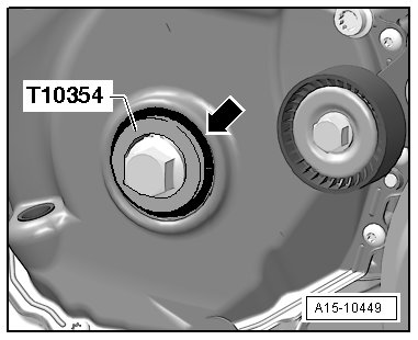 - Pull the seal - arrow - in using the thrust piece (T10354) and the vibration damper bolt.