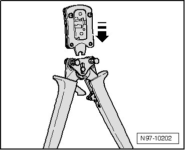 Crimping Pliers (VAS 1978/1A) or Crimping Pliers (Base Tool) (VAS 1978/1-2) together with exchangeable head 0.35 - 2.5mm/2 (VAS 1978/1-1) or exchangeable head 4.0 - 6.0mm/2 (VAS 1978/2A) from wiring harness repair kit is used to compress the crimp connections.
