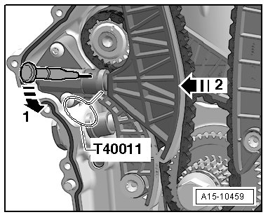 - Press the oil pump chain tensioner in the - direction of the arrow - and secure it using the locking pin (T40011).