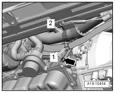 - Free up the coolant hose - 2 - and the wiring harness - 1 -.