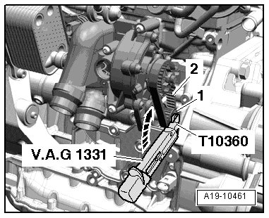 - Loosen the bolt - 1 - for the coolant pump drive gear clockwise using the torque wrench (5-50 Nm) (V.A.G 1331) and the insert tool 12 mm (T10360). Counter hold the vibration damper bolt using a 24 mm socket when doing this.