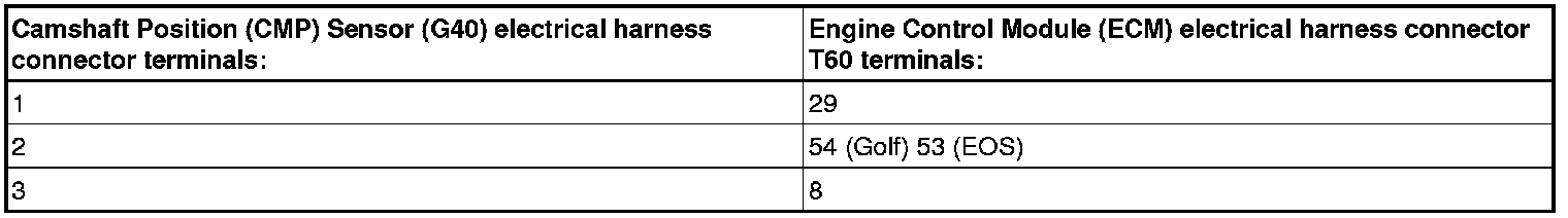 - Using a multimeter, Check the Camshaft Position (CMP) Sensor (G40) electrical harness connector to the Engine Control Module (ECM) electrical harness connector T60 for an open circuit or high resistance.