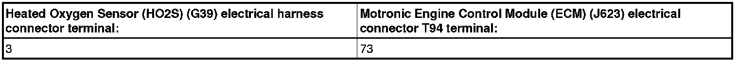 - Using a multimeter, check the Heated Oxygen Sensor (HO2S) (G39) electrical harness connector terminal to the Motronic Engine Control Module (ECM) (J623) electrical harness connector T94 terminal for an open circuit.