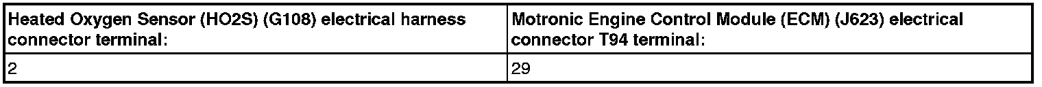 - Using a multimeter, check the Heated Oxygen Sensor (HO2S) (G108) electrical harness connector terminal to the Motronic Engine Control Module (ECM) (J623) electrical harness connector T94 for an open circuit.