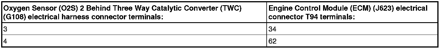 - Using a multimeter, check the Oxygen Sensor (O2S) 2 Behind Three Way Catalytic Converter (TWC) (G108) electrical harness connector terminals to the Engine Control Module (ECM) (J623) electrical harness connector T94 terminals for resistance.