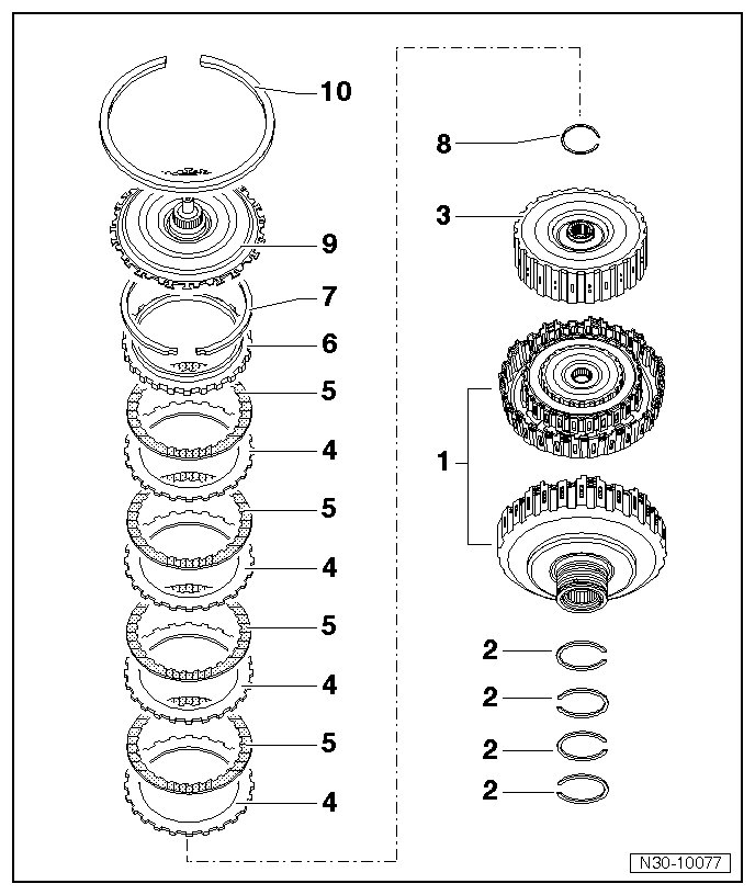 This illustration is only an overview of the components. The DSG(R) clutch must not be disassembled at this time since all outer and inner clutch discs were installed weighted to each other.