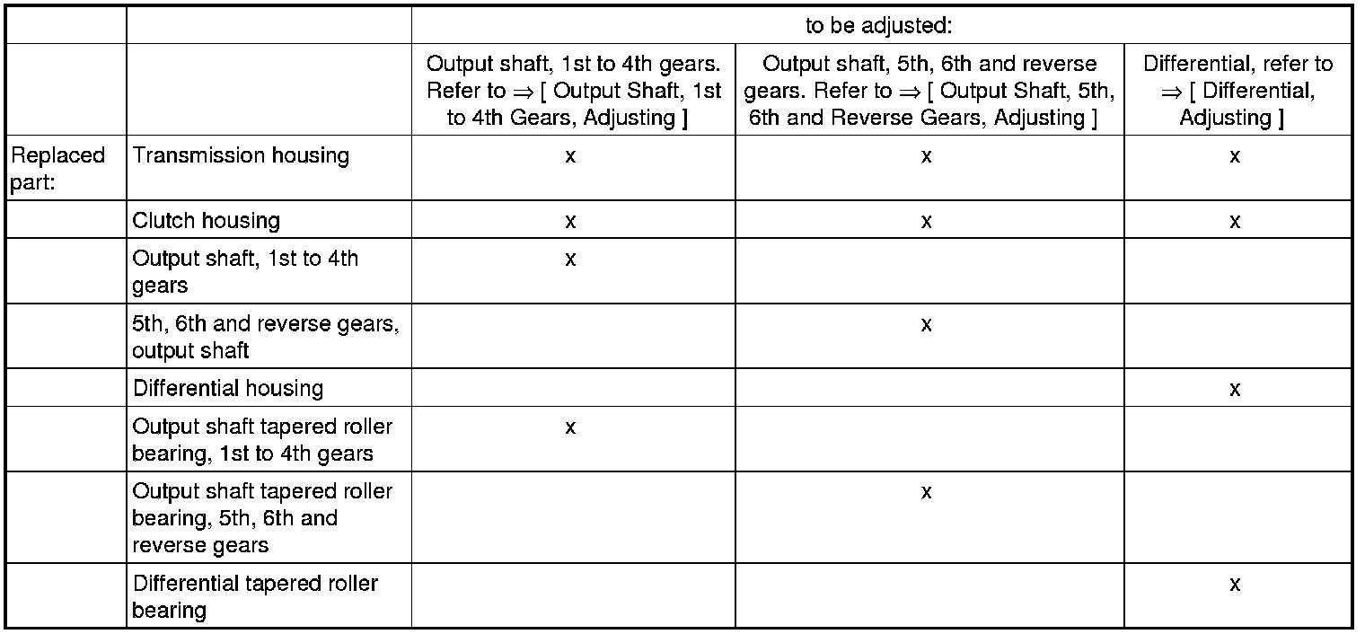 • When performing repairs on the transmission, readjustment of the output shaft for 1st to 4th gears, the output shaft for 5th, 6th and reverse gears or the differential is only required if components, which have a direct influence on transmission adjustment, have been replaced. Refer to the table to avoid any unnecessary adjusting.