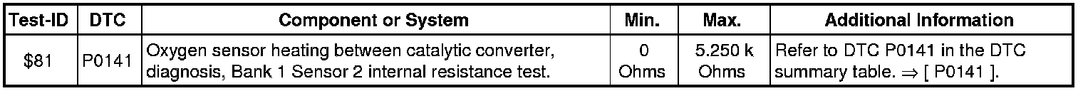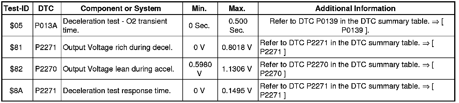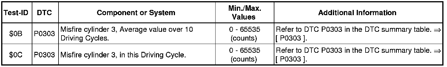 - If any of components or systems fail to meet the specified values. Refer to Diagnostic "Mode 03: Interrogating Fault Memory" to check for stored DTC's or the corresponding diagnostic repair procedure => [ Diagnostic Mode 03 - Read DTC Memory ] Diagnostic Mode 03 - Read DTC Memory. Diagnostic Mode 03 - Read DTC Memory.