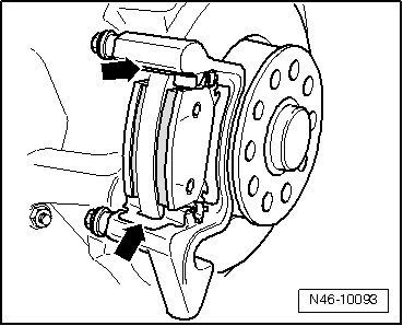 - Remove the brake pads and the brake pad retaining plates - arrows -.