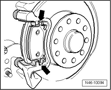 - Insert the brake pad retaining plates - arrows - and brake pads in the brake carrier.