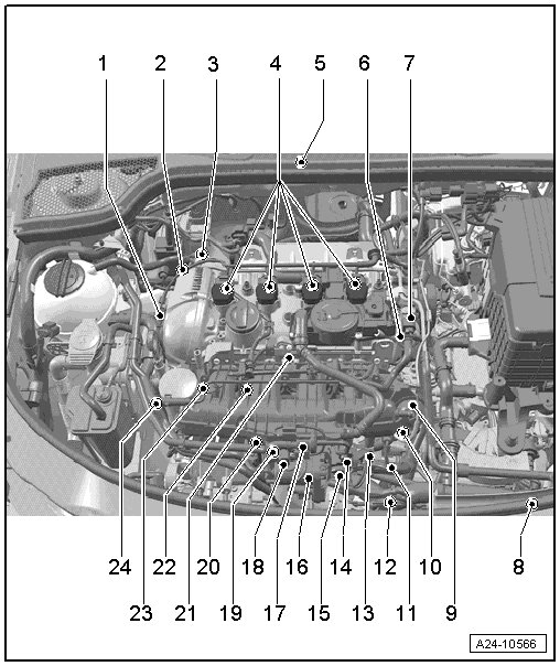 • Under the intake manifold (the intake manifold is not shown in the illustration).