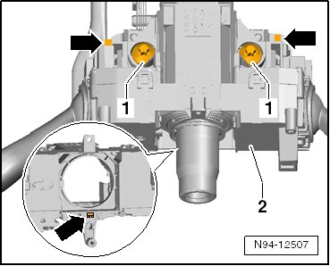 - Unlock all 3 releases - arrows - and remove the entire steering column combination switch (E595) from the steering column switch base carrier.