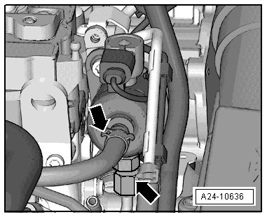 The fuel system is under pressure! Before opening the high pressure components of the fuel injection system, the pressure must be reduced to a residual pressure. Refer to => [ High Side Fuel Pressure, Releasing ] Service and Repair.