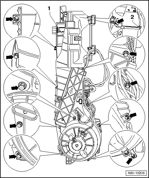 - Loosen the clips - 2 - and the bolts - arrows - from the heater.