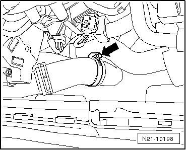 - Loosen the clamp - arrow - and remove the charge air hose.