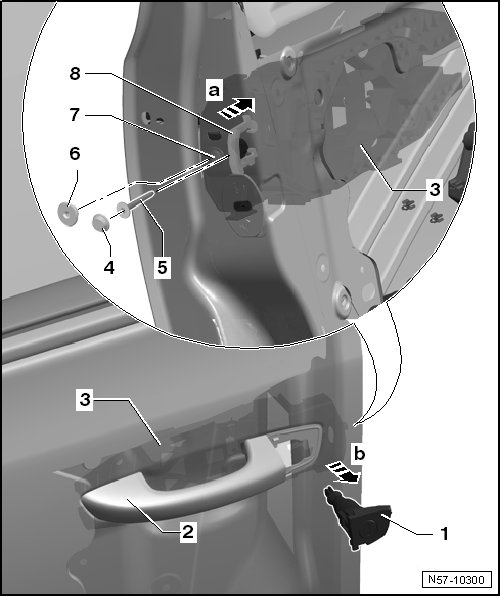 - Remove the lock cylinder housing - 1 - from the bracket - 3 - at a right angle - arrow b - to the door.