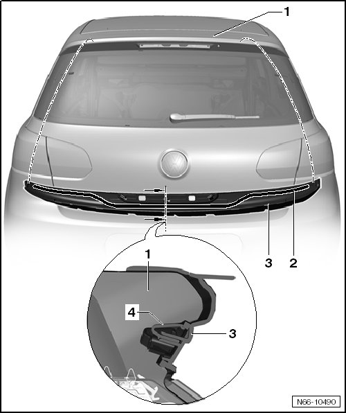 - Remove the retaining strip from the rear lid. When doing this, any remaining adhesive - 2 - will come loose. The hooks - 4 - in the brake lamp opening will likewise disengage.