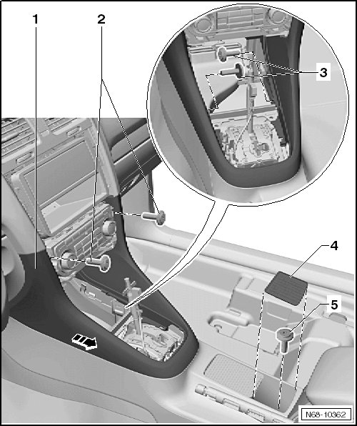 - Remove the cover on the center console - 1 - - in direction of arrow -.