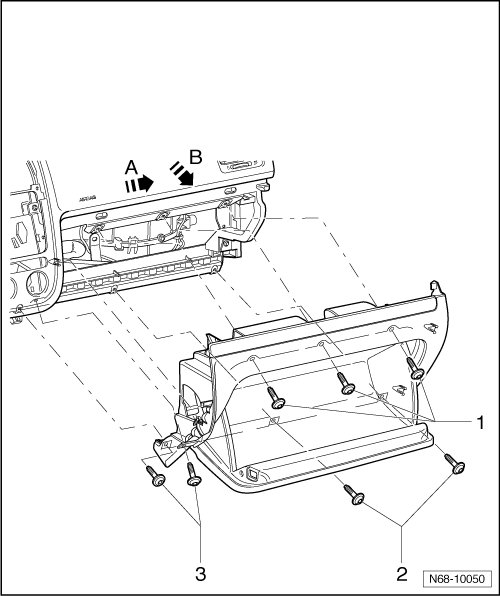 - Disengage the glove compartment from the instrument panel - arrow B -.