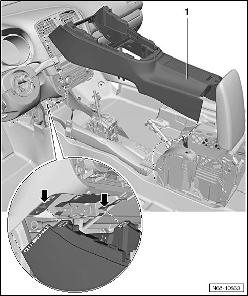 - Remove the cover on the center console - 1 - - in direction of arrow -.