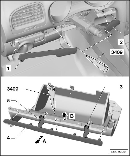 - Remove the tension strap clips - 3 - and - 5 - from the glove compartment - arrow B -.