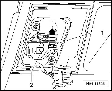 - Press the tab - 1 - in - direction of arrow - and remove the bulb holder - 2 - from the tail lamp assembly.