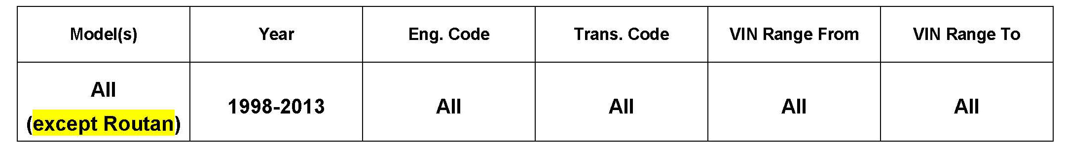 2-1 All Models 1998 - 2013, Except Passat/CC 3.6L, Eos 3.2L, Golf VR4/R32, Touareg, and Phaeton