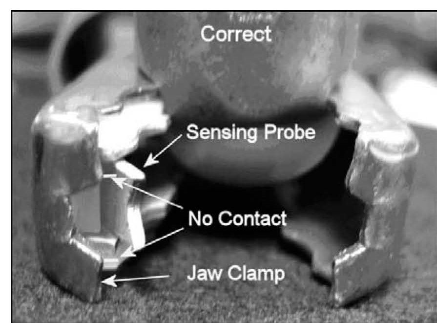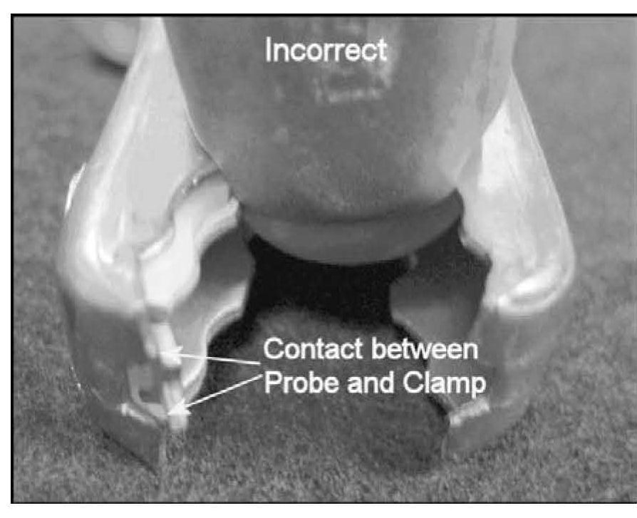 ^ Use a small flat tool and gently bend sensing probe so it does not make contact with clamp.