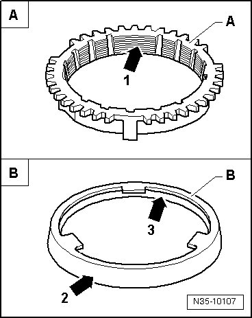 • Check the grooves - arrow 1 - on the synchronizer ring - A - and the inner race for flat areas (grooves are worn).