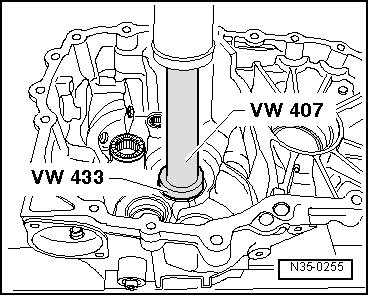 - Install the outer race/tapered roller bearing with the selected adjusting shim (in the example: 1.65 mm) Support the transmission housing directly under the bearing mount using the thrust plate (2050).