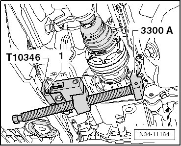 - Install the bracket (T10346) with a bolt - 1 - in the left threaded hole in the subframe.